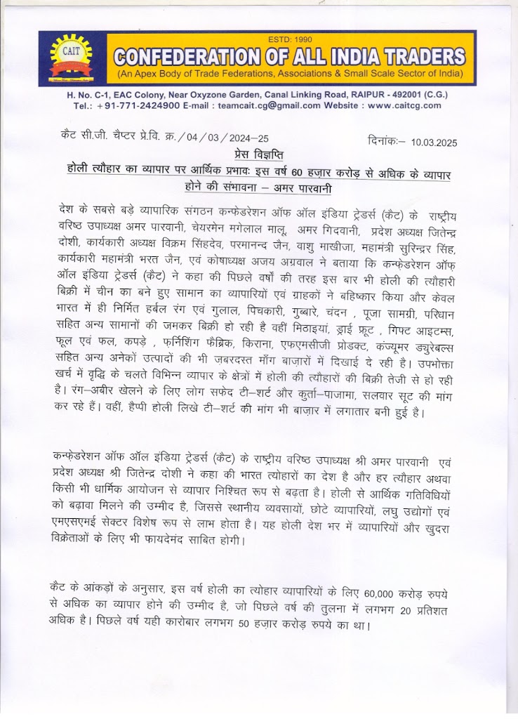 रायपुर, 10 मार्च । देश के सबसे बड़े व्यापारिक संगठन कन्फेडरेशन ऑफ ऑल इंडिया ट्रेडर्स (कैट) के राष्ट्रीय वरिष्ठ उपाध्यक्ष अमर पारवानी, चेयरमेन मगेलाल मालू, अमर गिदवानी, प्रदेश अध्यक्ष जितेन्द्र दोशी, कार्यकारी अध्यक्ष विक्रम सिंहदेव, परमानन्द जैन, वाशु माखीजा, महामंत्री सुरिन्द्रर सिंह, कार्यकारी महामंत्री भरत जैन, एवं कोषाध्यक्ष अजय अग्रवाल ने बताया कि कन्फ़ेडरेशन ऑफ़ ऑल इंडिया ट्रेडर्स (कैट) ने कहा की पिछले वर्षों की तरह इस बार भी होली की त्यौहारी बिक्री में चीन का बने हुए सामान का व्यापारियों एवं ग्राहकों ने बहिष्कार किया और केवल भारत में ही निर्मित हर्बल रंग एवं गुलाल, पिचकारी, ग़ुब्बारे, चंदन , पूजा सामग्री, परिधान सहित अन्य सामानों की जमकर बिक्री हो रही है वहीं मिठाइयां, ड्राई फ्रूट , गिफ्ट आइटम्स, फूल एवं फल, कपड़े , फ़र्निशिंग फैब्रिक, किराना, एफएमसीजी प्रोडक्ट, कंज्यूमर ड्युरेबल्स सहित अन्य अनेकों उत्पादों की भी ज़बरदस्त माँग बाज़ारों में दिखाई दे रही है। उपभोक्ता खर्च में वृद्धि के चलते विभिन्न व्यापार के क्षेत्रों में होली की त्यौहारों की बिक्री तेजी से हो रही है। रंग-अबीर खेलने के लिए लोग सफेद टी-शर्ट और कुर्ता-पाजामा, सलवार सूट की मांग कर रहे हैं। वहीं, हैप्पी होली लिखे टी-शर्ट की मांग भी बाज़ार में लगातार बनी हुई है।